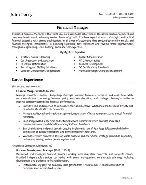 These include customer service, deal closing, and rapport building. Browse our database of 1,550+ resume examples and samples written by real professionals who got hired by the world's top employers. Do you need the best finance manager resume? Their job involves budget planning, producing and reviewing financial reports, monitoring accounts and making financial forecasts. If you need more help, you can always refer to the following resume sample for a position.
